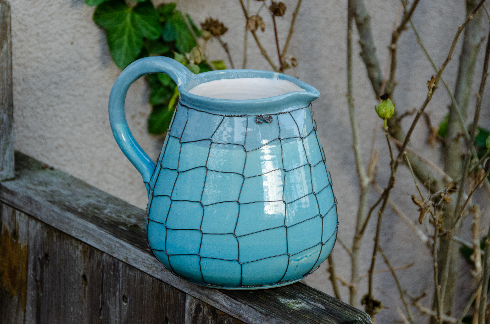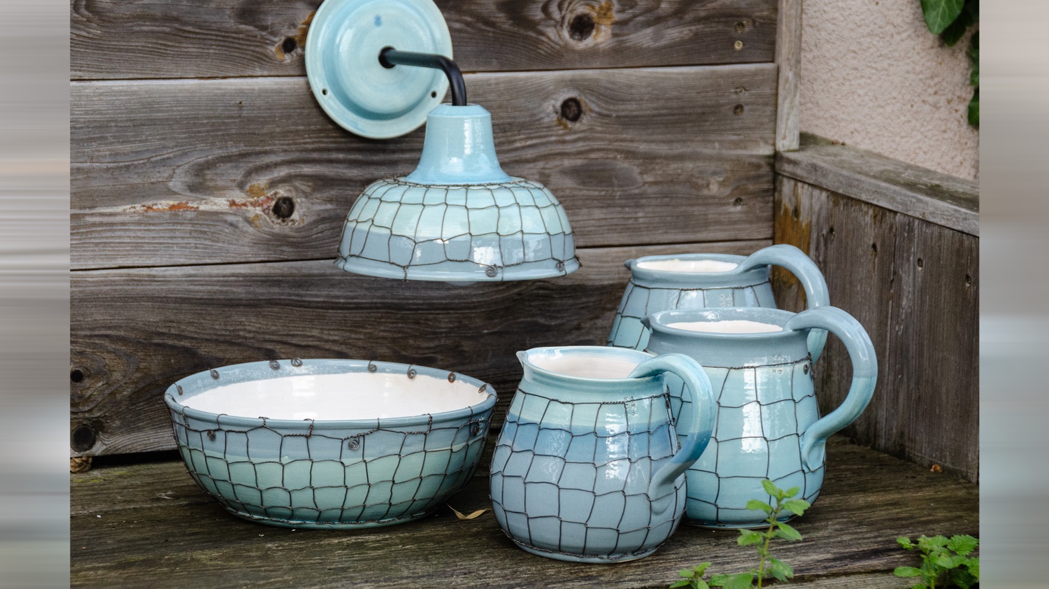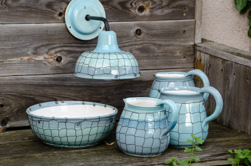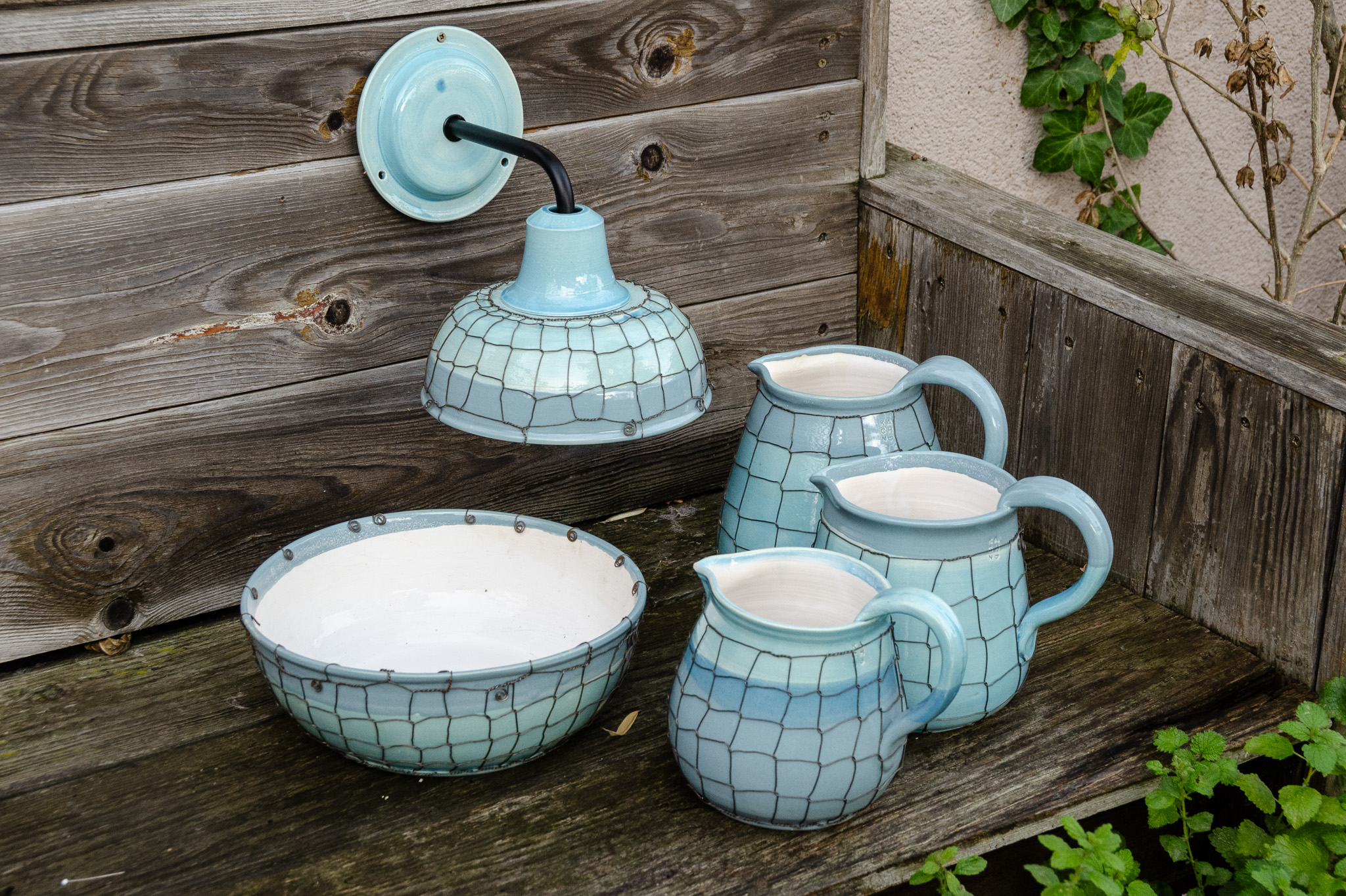 Keramické džbány ve třech velikostech, keramická mísa a navíc ještě keramická nástěnná lampa Taťána. Vše v tyrkysové barvě, vše drátováno. Vyberte si sami…