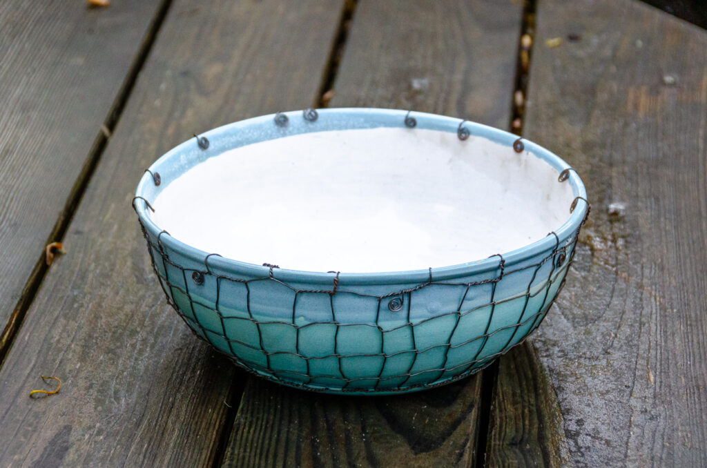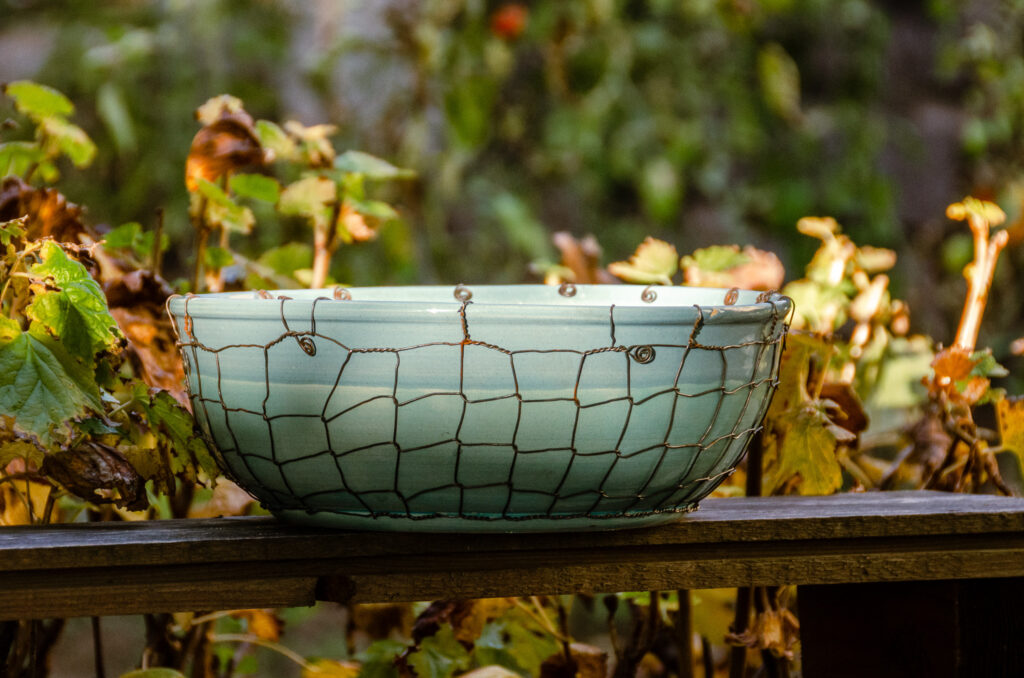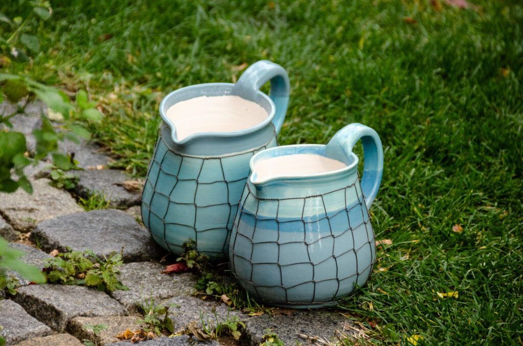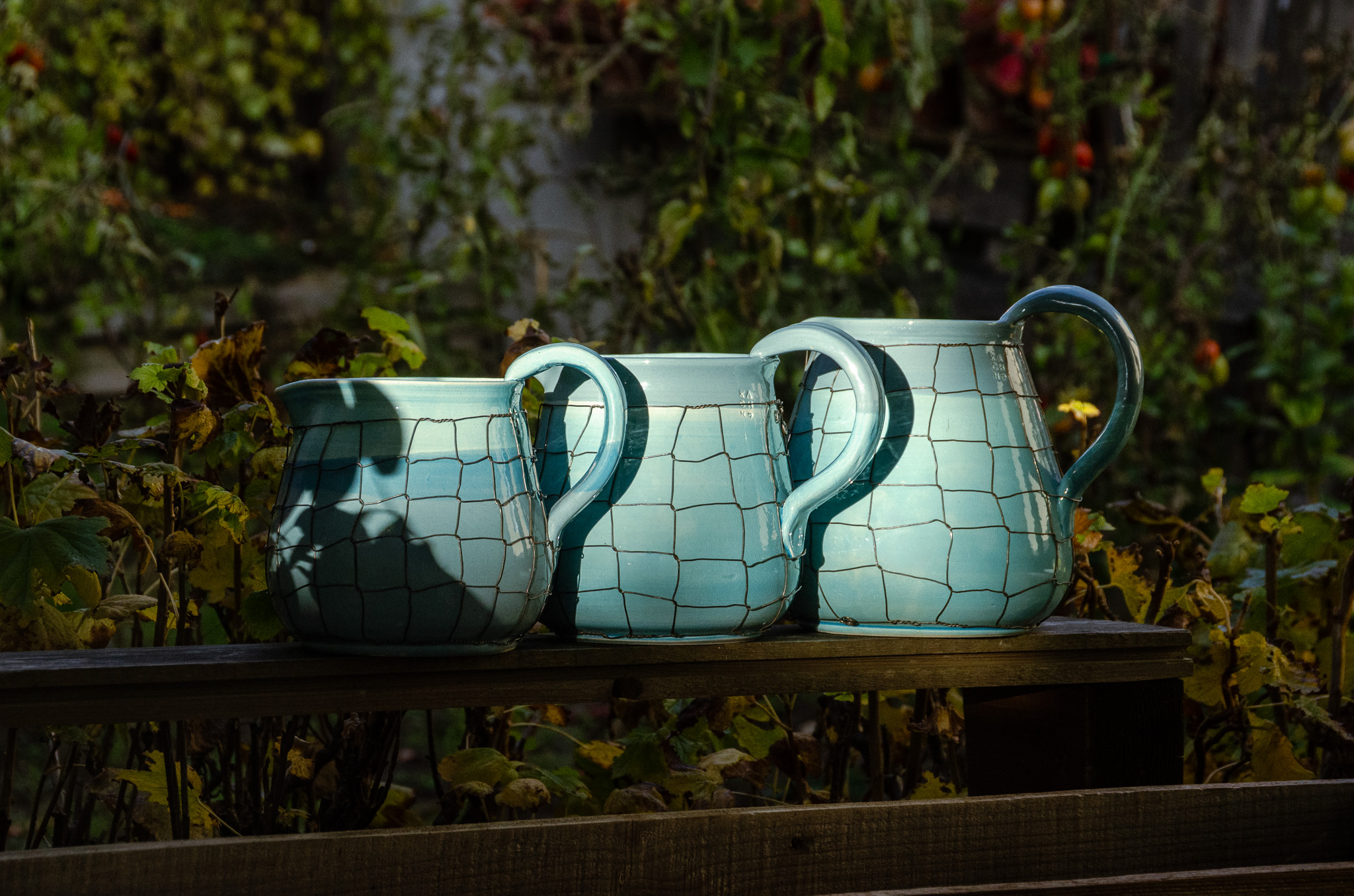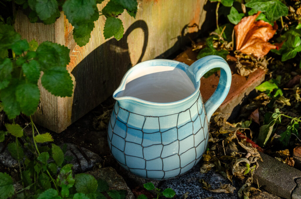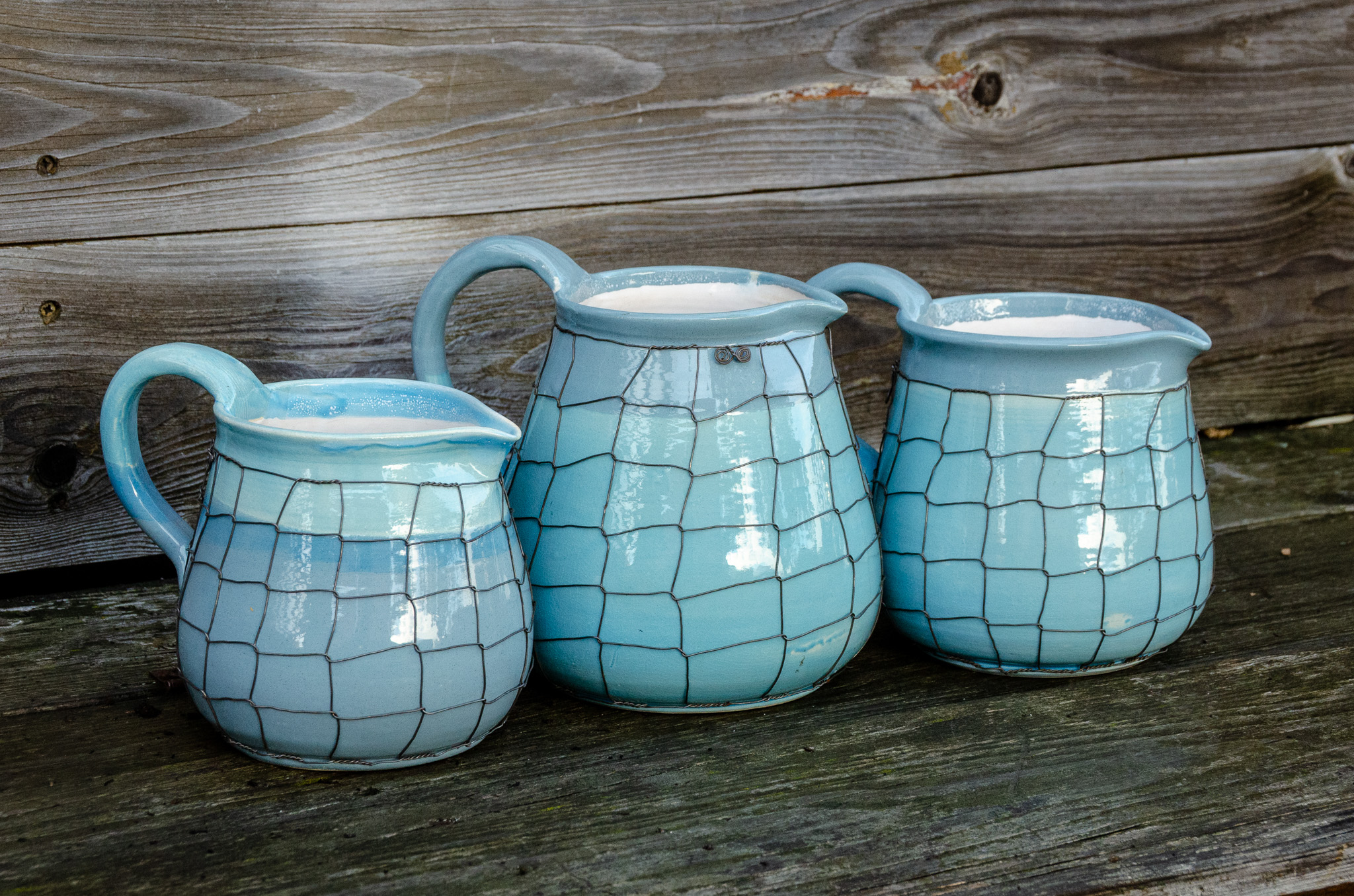 Keramické džbány ve třech velikostech, keramická mísa a navíc ještě keramická nástěnná lampa Taťána. Vše v tyrkysové barvě, vše drátováno. Vyberte si sami…