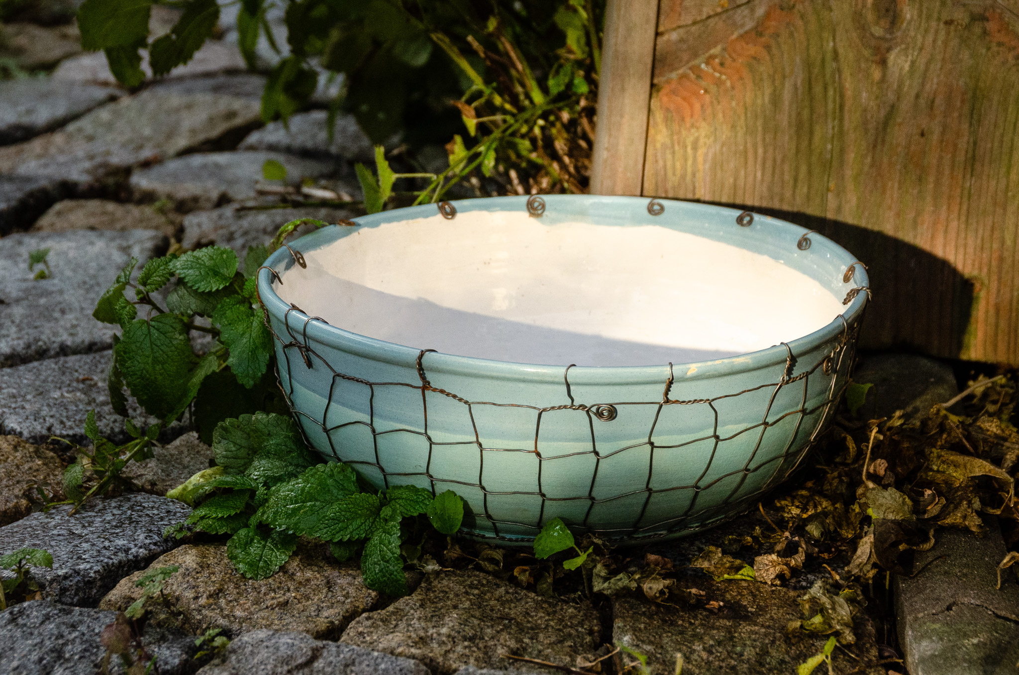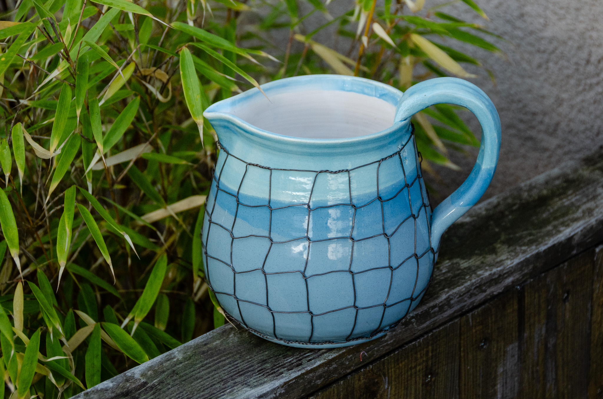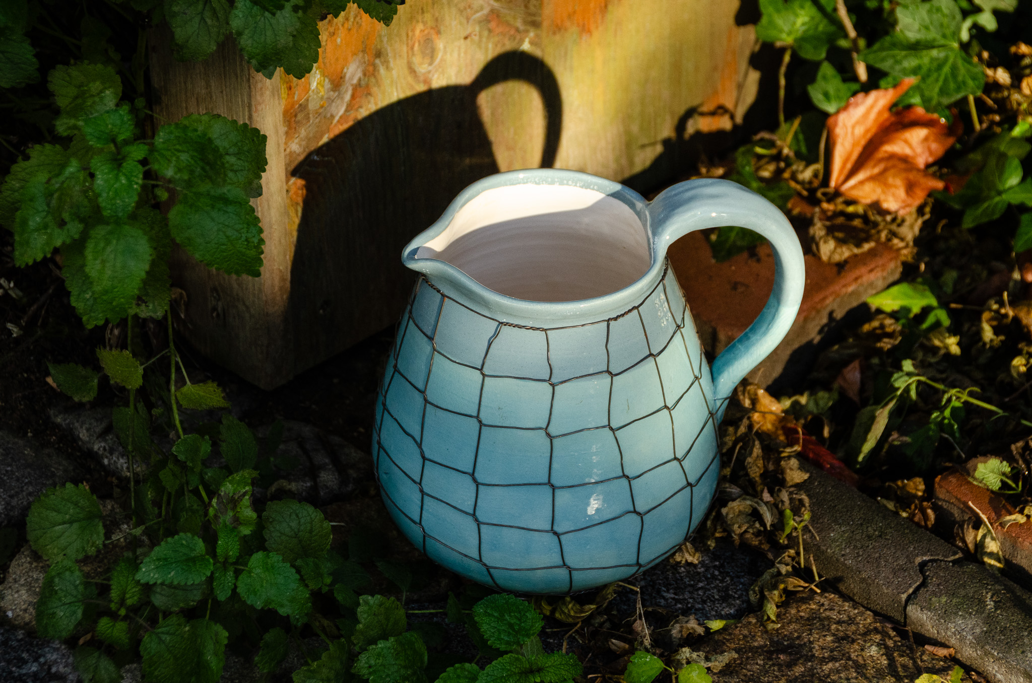 Keramika točená na kruhu a následně drátovaná. Glazovaná z vnější i vnitřní strany, drátovaná hutním, taženým drátem (není nerezový). Nástěnná lampa má přívod elektřiny řešený ze zdi. Patice na žárovku E27 (běžná velikost žárovky).