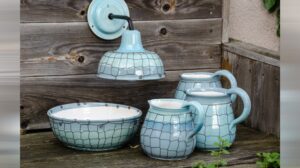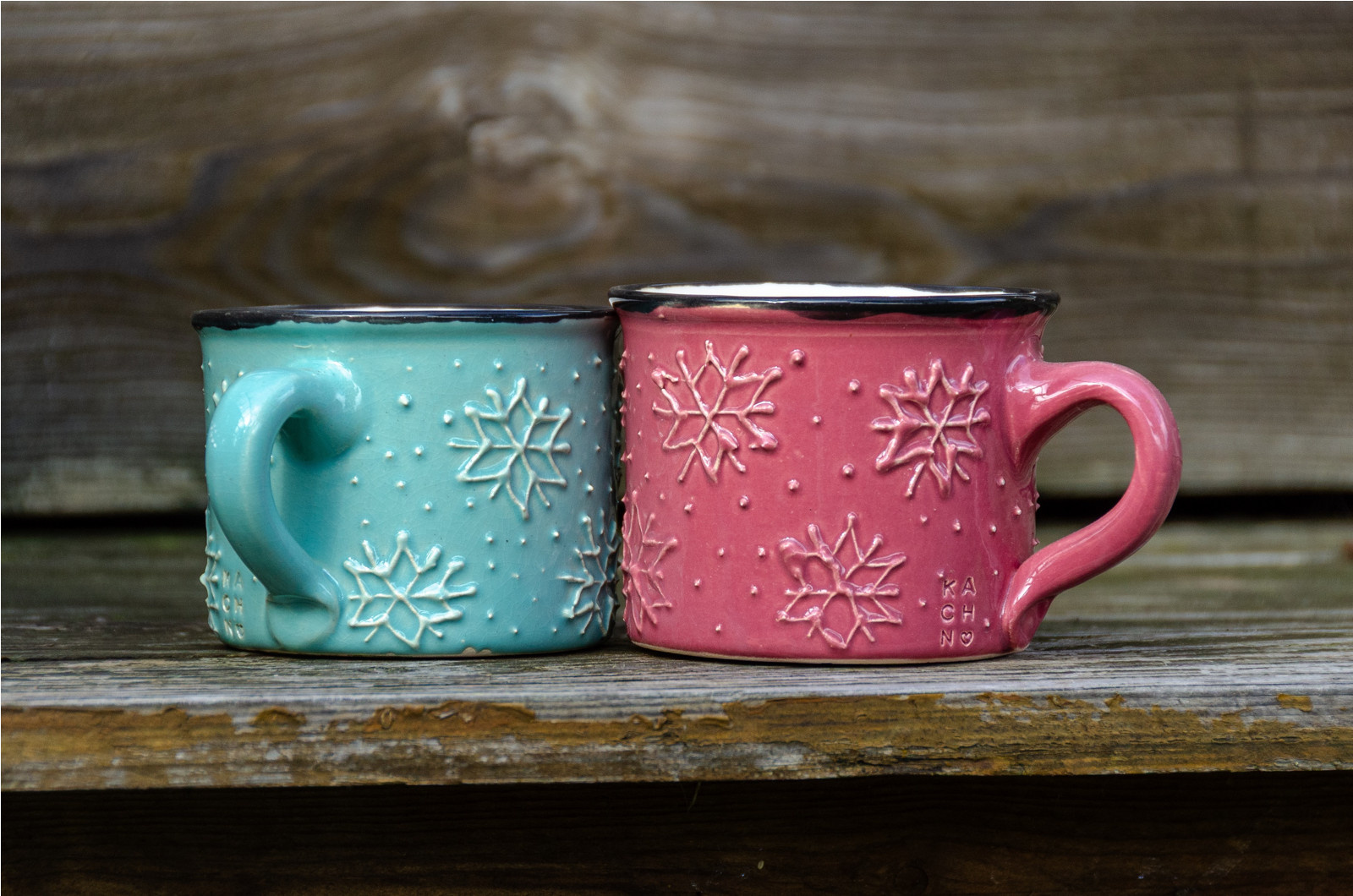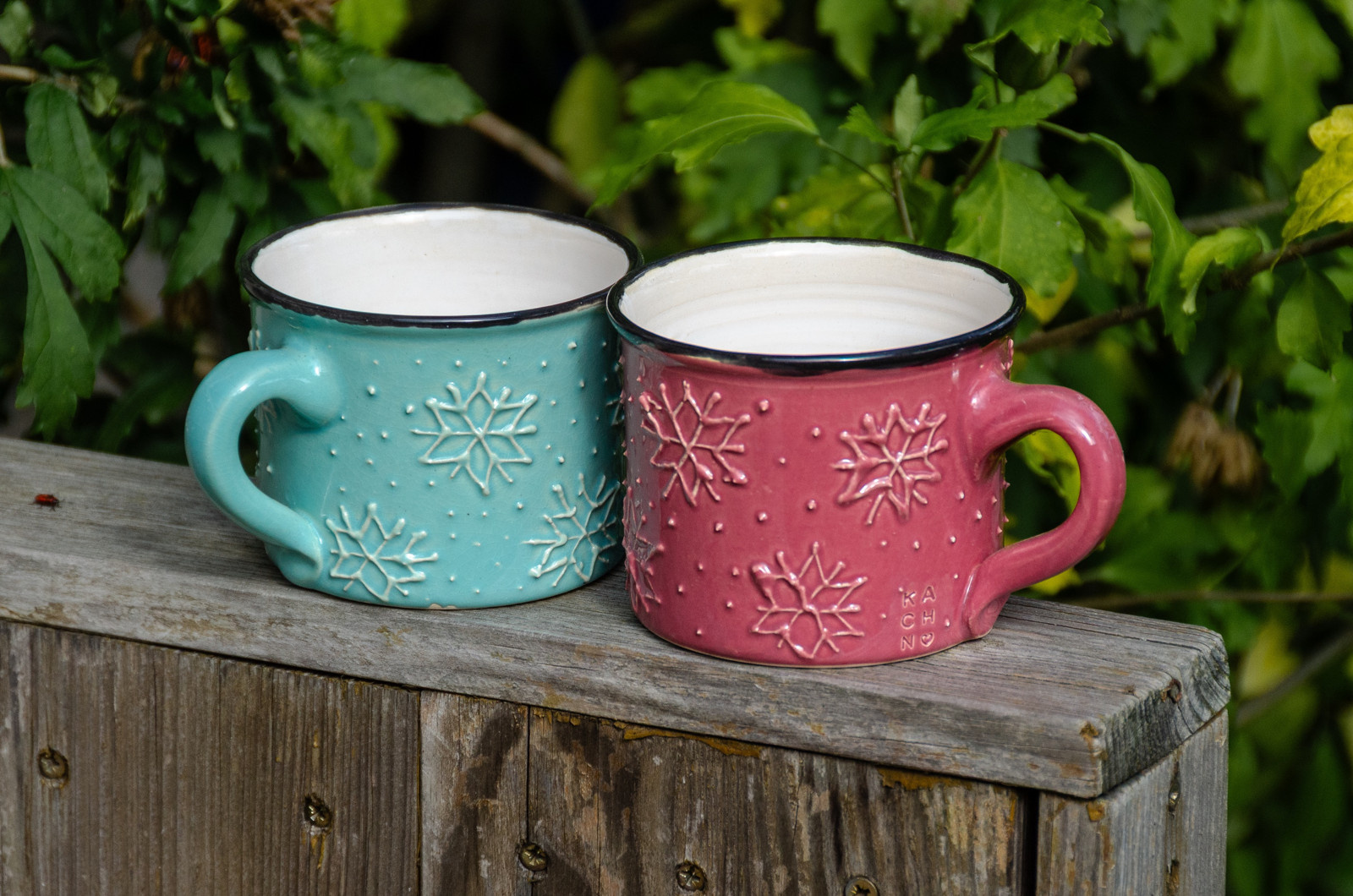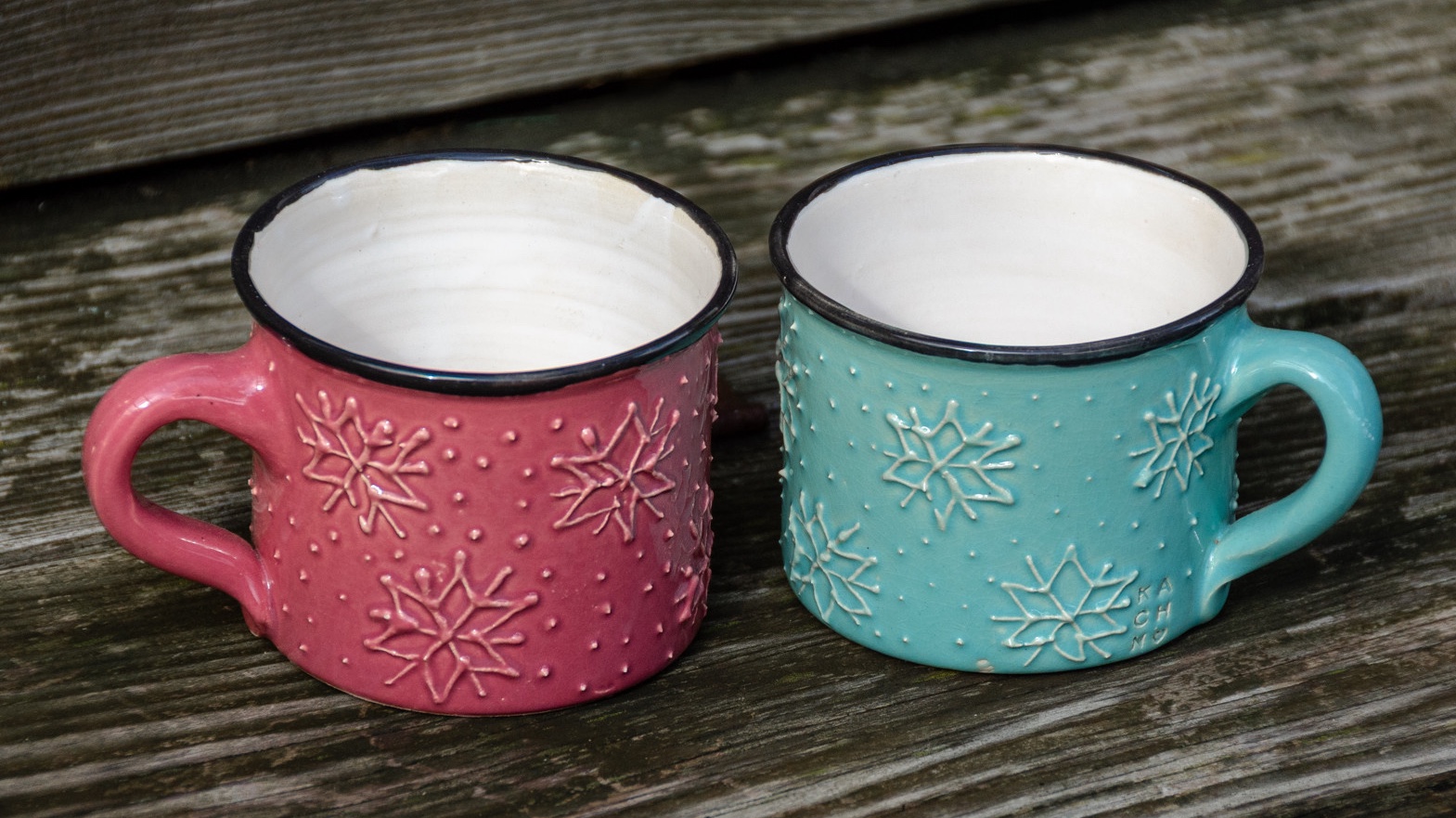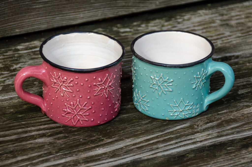 Keramické hrnky v plechovém stylu jsou dekorovány vločkami. Použitá glazuje je zdravotně nezávadná.