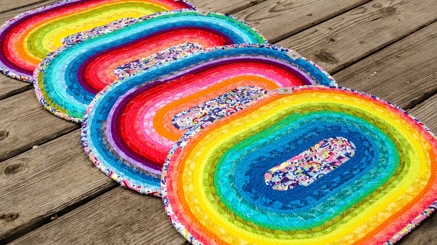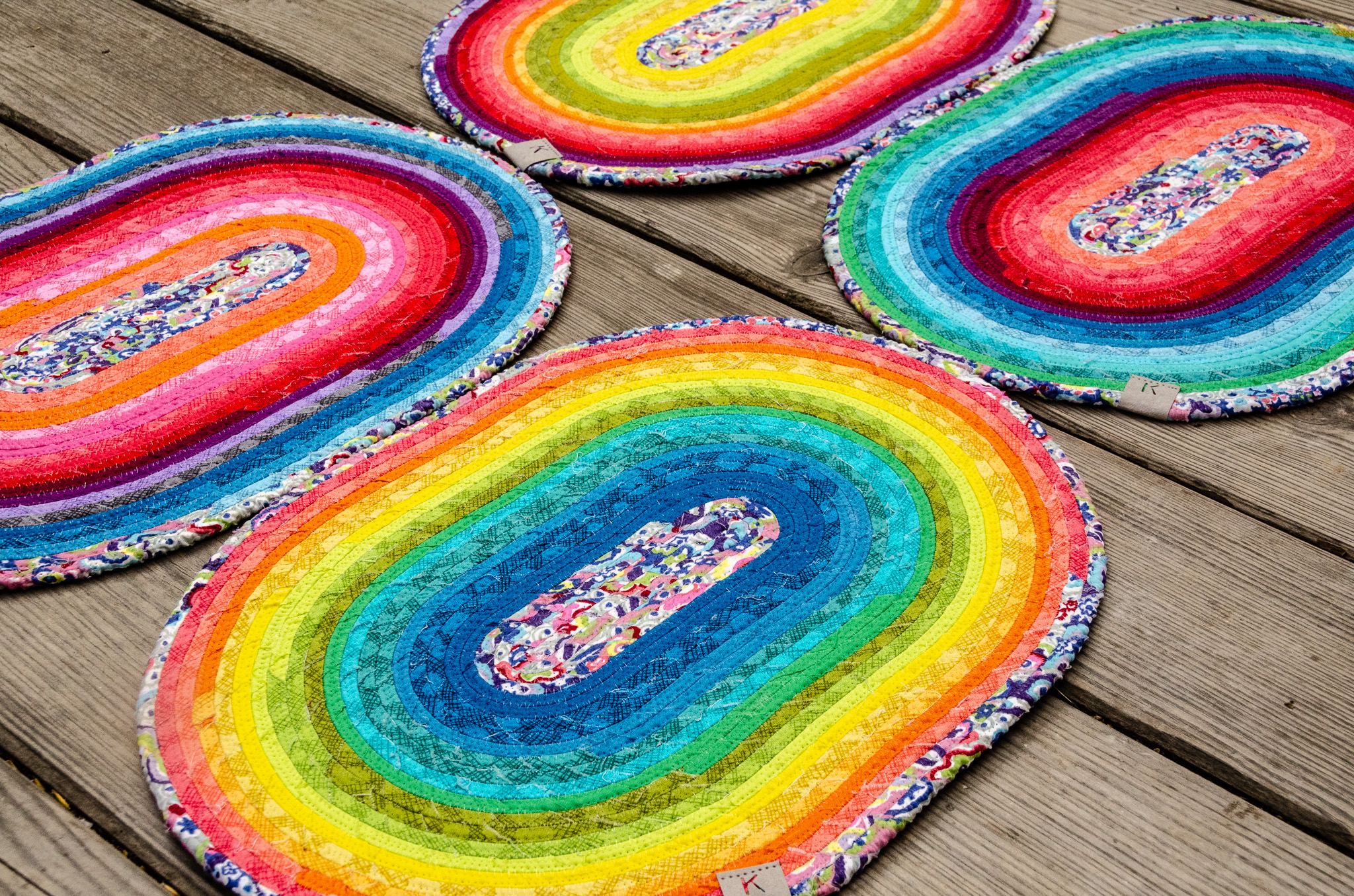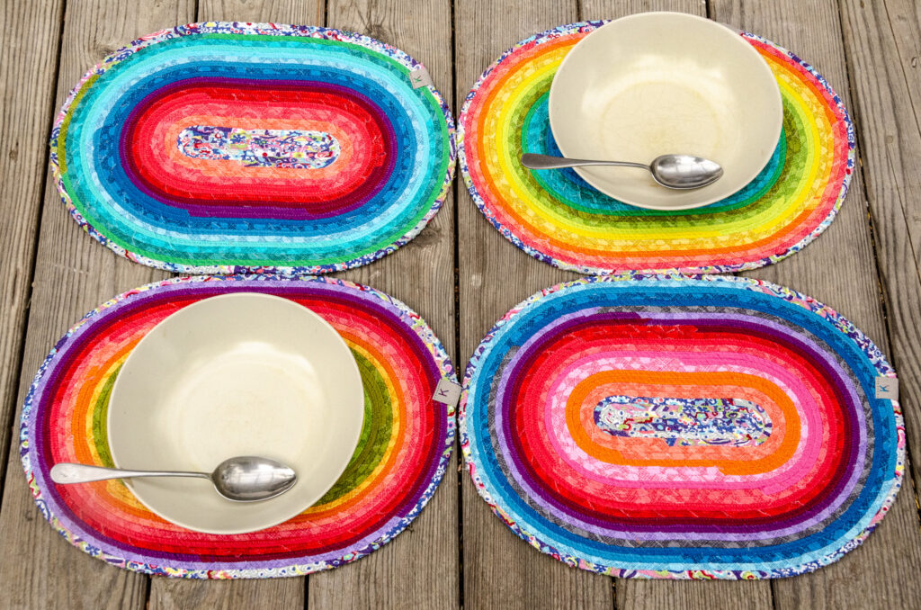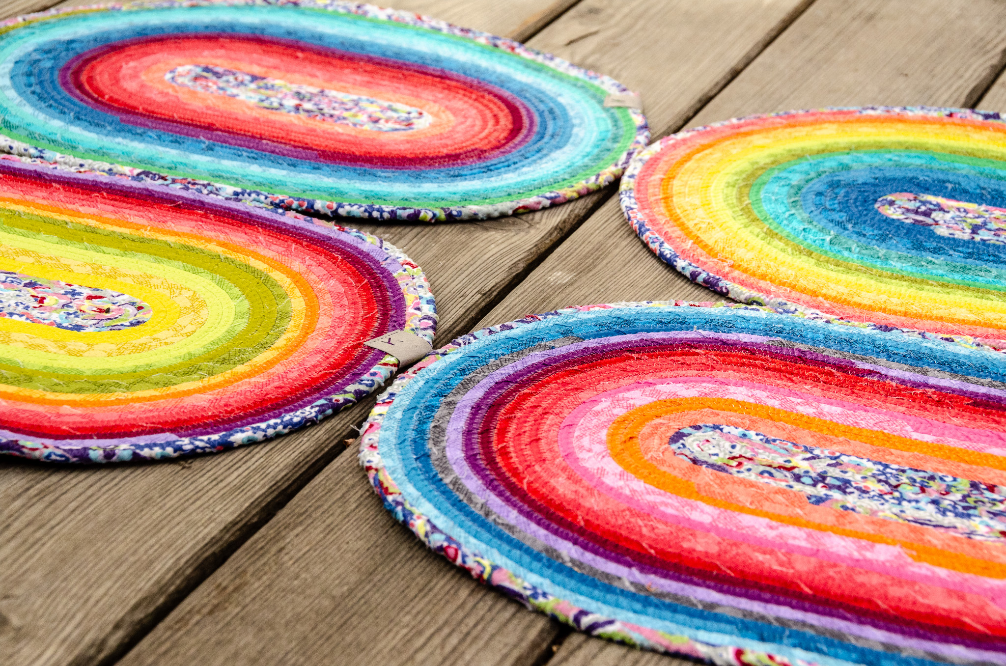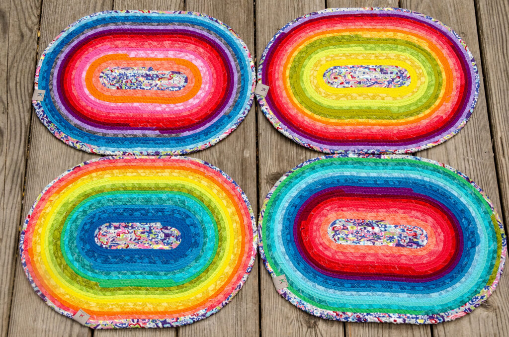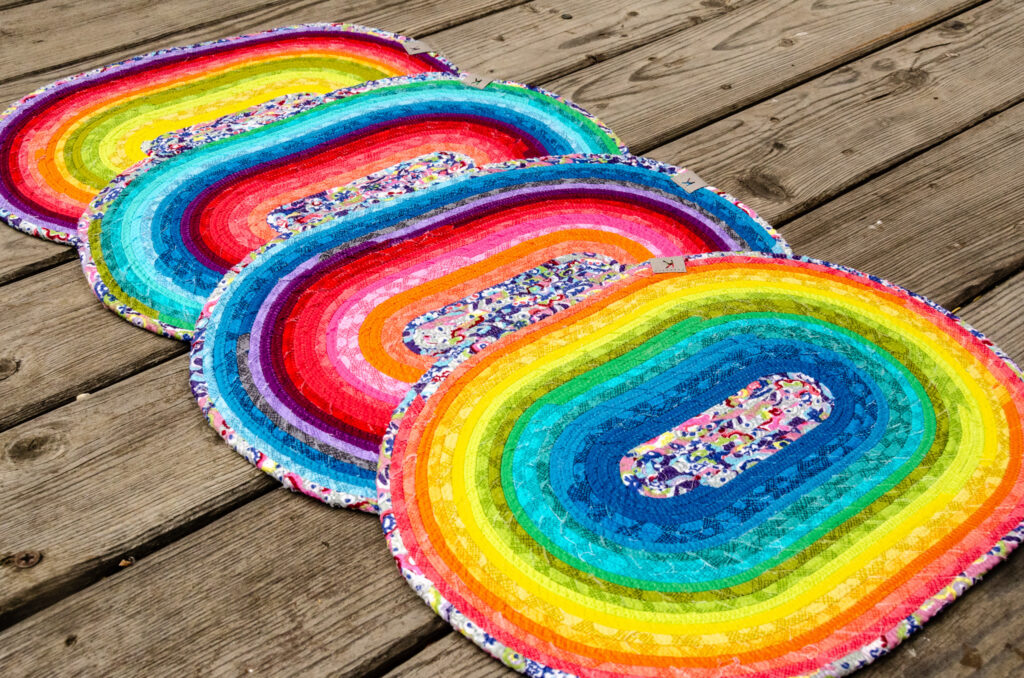 Prostírání ze šňůry je vyrobené sešitím bavlněné šňůry, omotané různobarevnými látkami (viz náš článek na blogu, popisující sice tvorbu koberce ze šňůry, jde však o stejnou technologii).